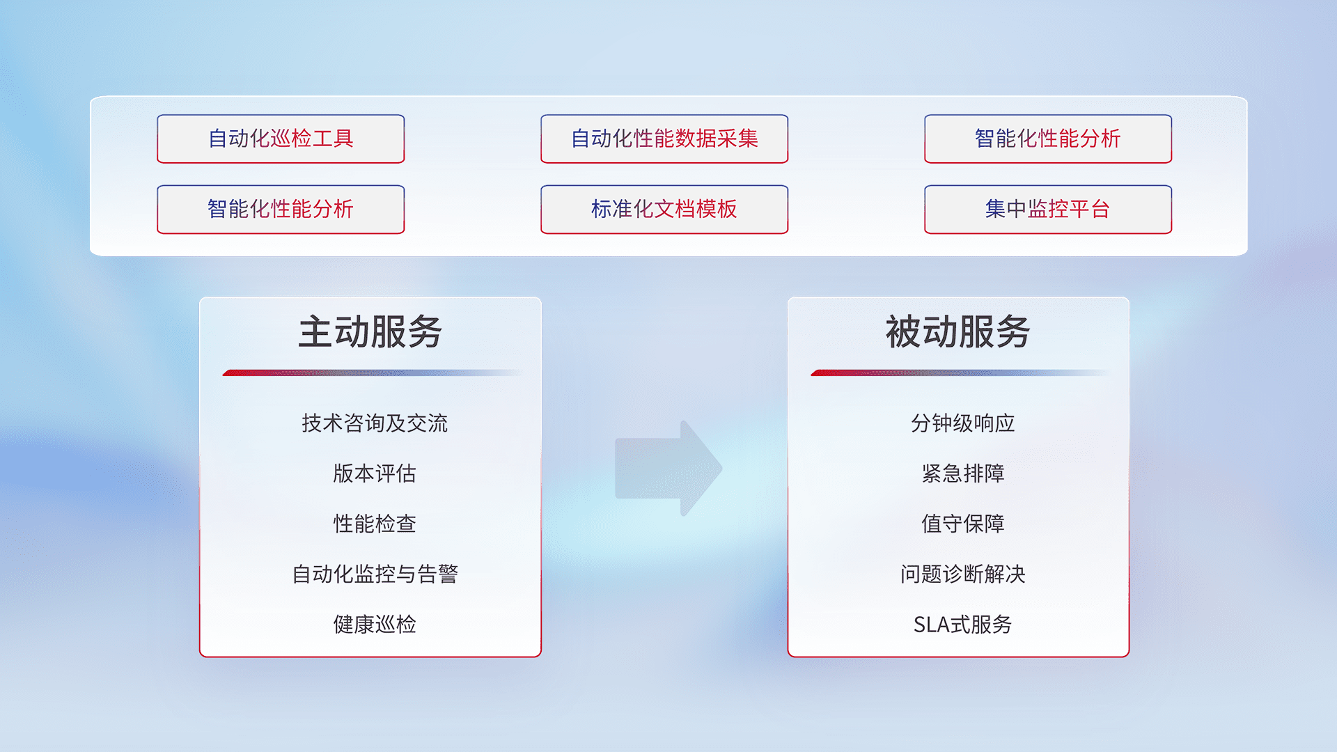 智能化工具和标准化文档,,保障服务质量,,提供主动服务(包含技术咨询、、版本评估、、、、性能检查、、、自动化监控与告警、、、健康巡检)和被动服务包含(分钟级响应、、紧急排障、、值守保障、、问题诊断解决、、、SLA服务)。。。